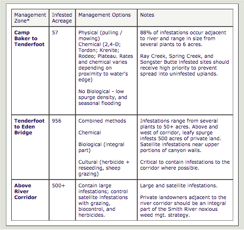 In 1996, Weed Management Service (WMS) prepared a report titled “Leafy Spurge Management on the Smith River” for the Montana Department of Fish, Wildlife and Parks (FWP). The purpose of the report was to 1) summarize historical information regarding management of leafy spurge on the Smith River; 2) discuss management activities conducted in 1996; and 3) outline management options and strategies for noxious weeds within and adjacent to the Smith River corridor.